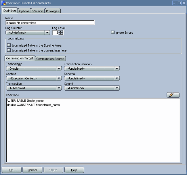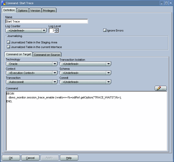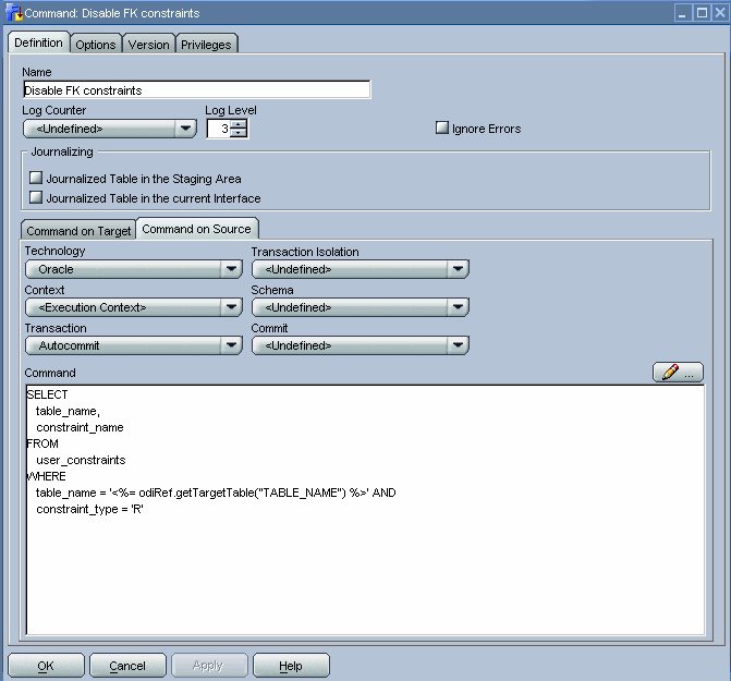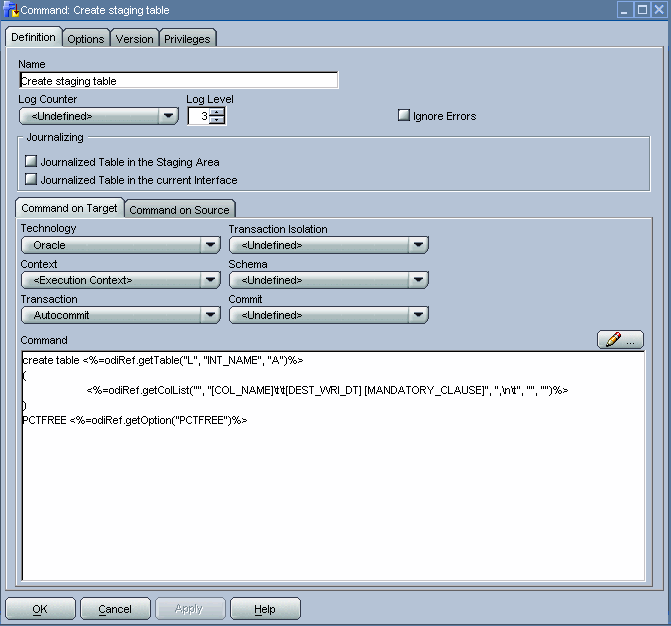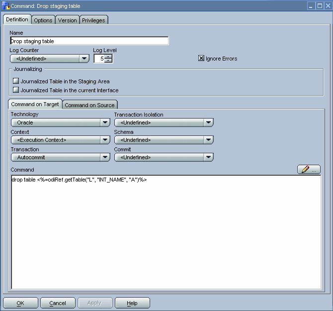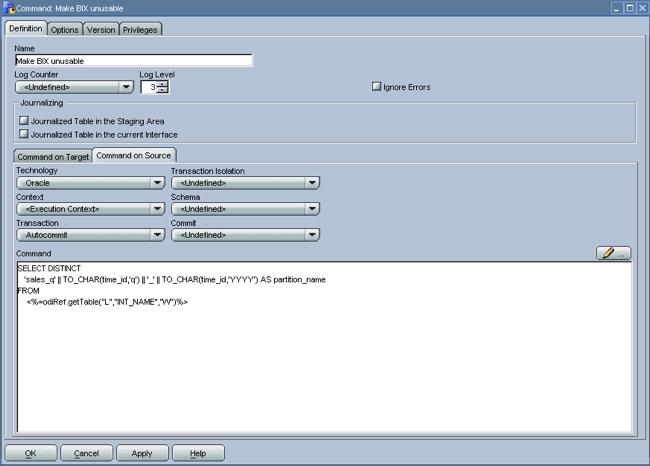 As in the previous step, we once more use an implicit Oracle Data Integrator cursor to implement this step. For the Command on Source tab we use a mix of SQL and Oracle Data Integrator substitution API methods to retrieve the distinct time_ids inserted into the staging table. Based on these time_ids, we can determine the partitions to which they relate in the target table. The odiRef.getTable("L","INT_NAME","W")substitution API method will retrieve the staging table for us.