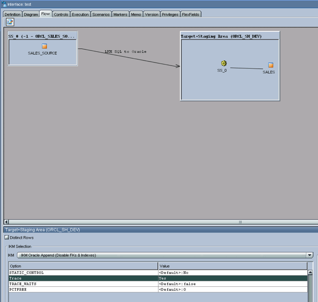 Next click the Target+Staging Area. Select our IKM Oracle Append (Disable FKs & Indexes) from the IKM Selection drop-down menu. In the Option area at the bottom of the screen, highlight the Trace Option and set it to Yes. This will override the default value for tracing, and as a result tracing will be enabled in the execution of our interface.