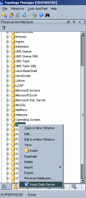 First we create the physical architecture for the source schema. In Topology Manager, select the Physical Architecture tab and expand Technologies. Right-click Oracle and select Insert Data Server.