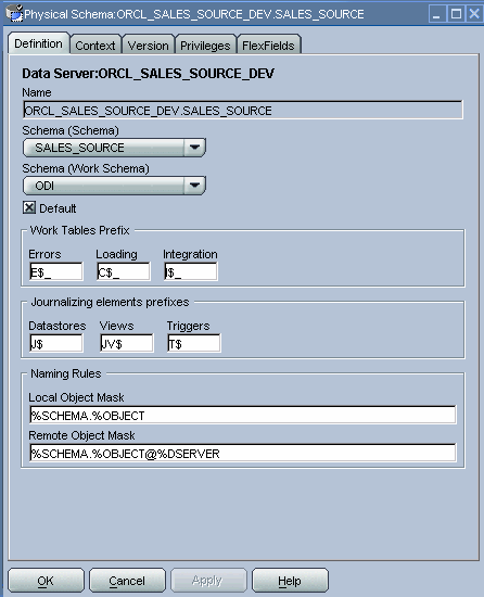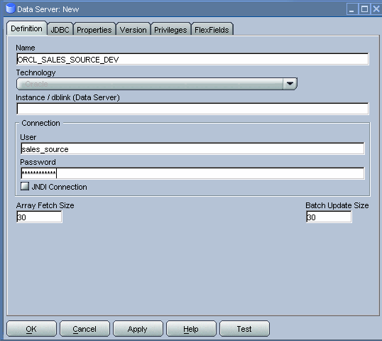For the name of the data server, we follow the naming guidelines in the Oracle Data Integrator Best Practices for a Data Warehouse guide: <TECH_NAME>_<SRV_NAME> (in uppercase). So we will name the data server ORCL_SALES_SOURCE_DEV. We populate the other fields on the Definition tab as shown in the figure below.