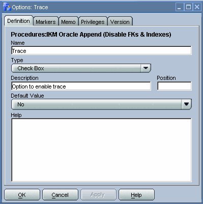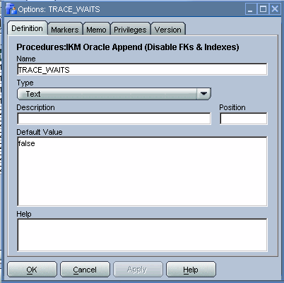 As you can see from the figure below, we want to make tracing wait events optional. For that purpose, we have defined an option named TRACE_WAITS. We can reference this option via the getOption substitution API method. Also, we have defined a default value of false for the Option. As such, tracing is disabled by default when the IKM is executed in an interface. We can later override this value when executing the IKM via an interface.