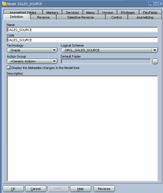 On the Definition tab, type in SALES_SOURCE for the Name. Select Oracle from the Technology drop-down menu and ORCL_SALES_SOURCE from the Logical Schema drop-down menu.