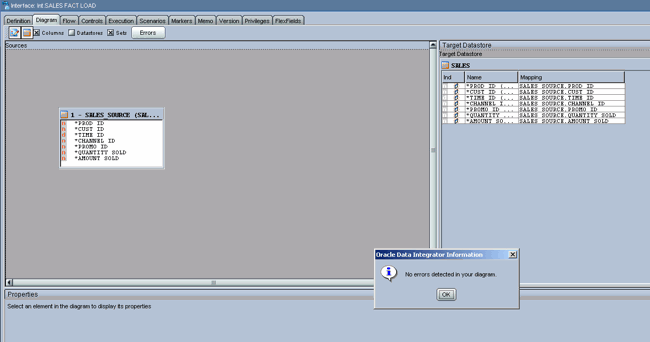Change to the Diagram tab. From the Models tab, drag and drop the sales_source datastore from the Sales_Source model to the Sources area. Drag and drop the Sales table from the SH model to the Target Datastore area. You are then prompted to perform an automatic mapping. Confirm this with Yes.