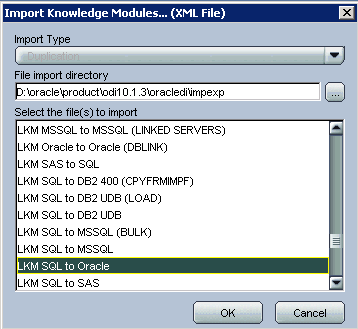 To import a KM log in to Designer, click the Projects tab, and expand Knowledge Modules. Right-click Loading (LKM) and select Import Knowledge Modules. Browse to the Import Export folder (<odi home>\oracledi\impexp) and select LKM SQL to Oracle. Click OK.