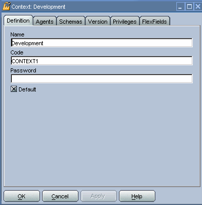 We create contexts with the Topology Manager. For the purpose of this article, we will just create a Development context. In Topology Manager, click the Context tab and then click the Insert Context icon. This will bring up the Definition tab for the context. Populate the fields as shown in the figure below.