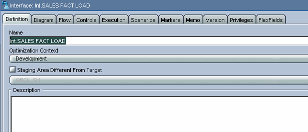 Expand the EDW project and also the First Folder. Right-click Interfaces and select Insert Interface. According to the best practice guide, the naming convention for interfaces is Int.<TARGET_TABLE> <DETAILS>. We will name our interface Int.SALES FACT LOAD. Also set the Optimization Context to Development from the drop-down menu.