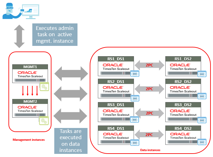 Centralized management and administration is a key feature of TimesTen Scaleout. Installation, configuration, management and monitoring are all performed from a single location (the management instance). This simplifies day to day operations and reduces the DBA's workload. Key management functions include: