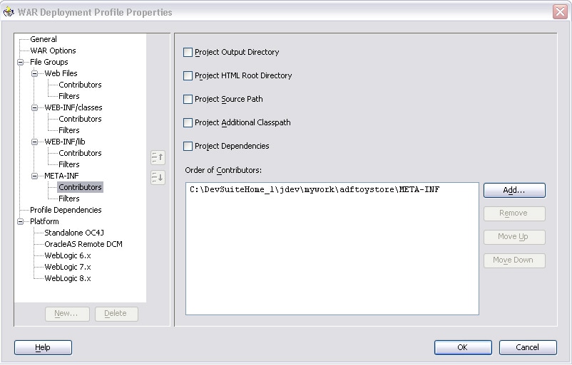 Add the META-INF directory under your adftoystore project directory as a contributor to the file group you just created. Click Contributors under the META-INF file group, remove all default values and click Add. In the Add Contributor dialog, click Browse and select <Project directory>\adftoystore\META-INF in the file system navigator.