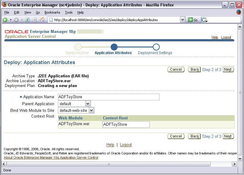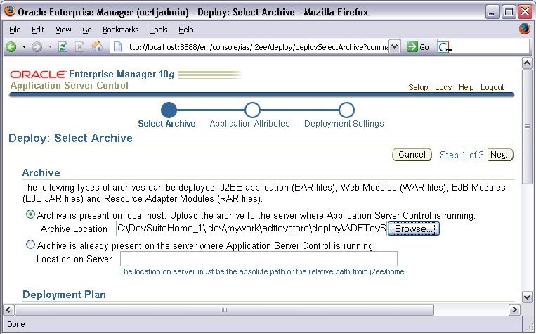 Deploy the ear file to the 10.1.3 OC4J instance by using the Application Server Control by opening http://<server name>:<port>/em in a web browser. After logging into the administration console, click the Applications tab and click Deploy. In Step 1 of 3, choose the Archive is present on local host. Upload the archive to the server where Application Server Control is running radio button. Click Browse and use the file system navigator to select the ear file in the <Project directory>\adftoystore\deploy directory.