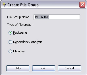 In the Create File Group dialog, name the file group you intend to create META-INF and choose Packaging for the Type of file group. Then, click OK.