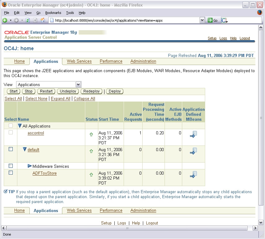 Accept all of the defaults in Step 3 of 3 and click Deploy. After the deployment completes click Return and you will be forward back to the main screen of the Application Server Control. The ADFToyStore application should have a green arrow under the status column.