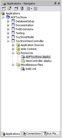 Next, you must add the META-INF directory that contains the orion-application.xml to the deployment profile so that it is deployed to the 10.1.3 application server. To do so, double click the ADFToyStore.deploy profile located under the resources node in the ToyStoreViewController project from within the Application Navigator tab.