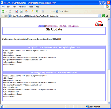 The sample application presented in this article is a simple example built for testing in an easy way the message flow described in this article. The application lets you query and update the data stored in the HSS. It's possible to send out Sh-Pull, Sh-Update, and Sh-Subs-Notify requests using a simple Web interface. You can choose the user name, the type of request, the service name, in case of Sh-Pull, and the service data and service value in case of Sh-Update. This application shows that WLSS can successfully communicate with an HSS and conforms to 3GPP Technical Specification documents for the Sh interface.