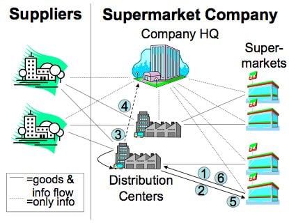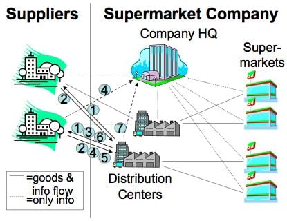 The suppliers deliver goods to the distribution centers of the supermarket company. Different suppliers are specialized for different sets of products and they deliver goods on demand, i.e. they must receive an order from the supermarket company to send a shipment.