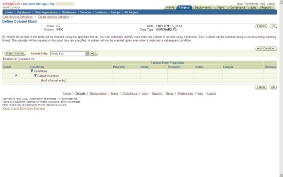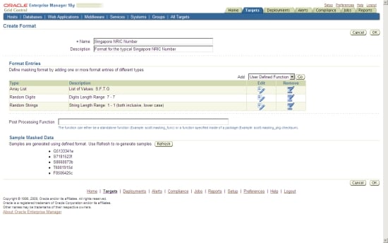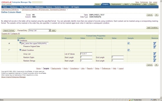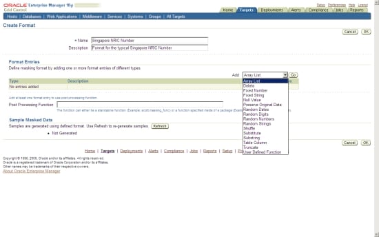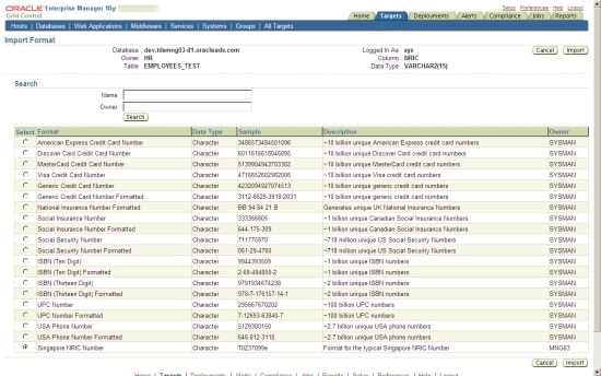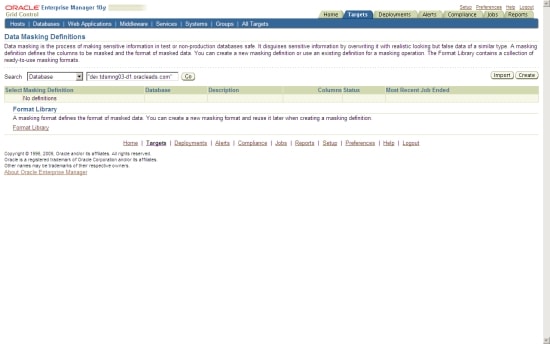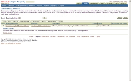 The centralized capabilities of Oracle Enterprise Manager Grid Control are well suited to the new Oracle Data Masking Pack. The idea is to store all data masking formats centrally in a library, and then apply them to any database that is managed by Oracle Enterprise Manager Grid Control.