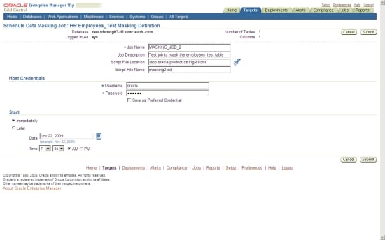 Clicking this button allows you to create an Oracle Enterprise Manager job that will execute the script at the time and date you specify or immediately. The host credentials also need to be specified at this stage. See Figure 19.