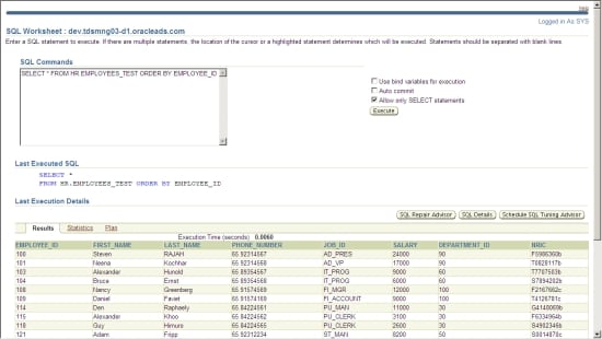 You can now re-examine the data in the HR.Employees_test table by using the SQL Worksheet in Oracle Enterprise Manager Grid Control.