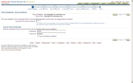 On the next page, you specify the source options for the clone database process. Concurrent file copy processes can be specified to speed up the cloning via the RMAN duplicate feature.