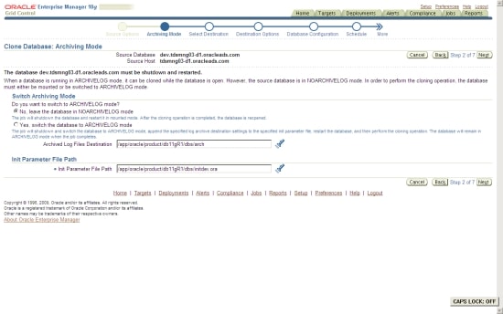 If the source database is in NOARCHIVELOG mode, it must be shut down and restarted in the mounted mode for the cloning to proceed, or you can switch to ARCHIVELOG mode at this stage of the process. See Figure 25.