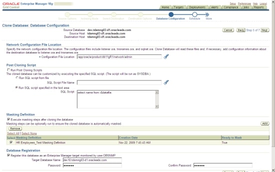 Go back to the Data Masking Definitions screen shown in Figure 17 and click the Clone Database button to see how the data masking process is tied in with the cloning process in a secure clone-and-mask workflow.