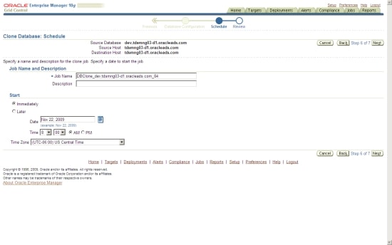 Moving to the next step allows you to schedule the Clone Database job, either immediately or at a future date and time using the Oracle Enterprise Manager job scheduler. See Figure 29.