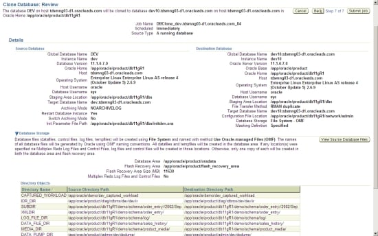 Finally, the Clone Database: Review screen appears (Figure 30). You can verify the cloning process information, including the files that are to be created, under the Database Storage section on this page.