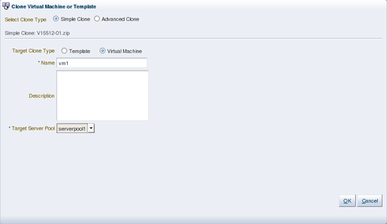 - In the Clone Virtual Machine Template dialog box (shown in Figure 4), choose Simple Clone for the clone type, and select Virtual Machine for the target clone type. Also, enter a name for the virtual machine being created.