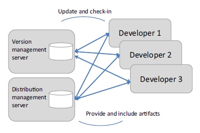 The changes from multiple developers are integrated continuously and automatically. Each version of the build is the basis of later releases and distributions. As shown in Figure 1, a build—local and central ones—checks out and may update sources from the VCS and consumes and produces artifacts from and to a component repository (also called a binary manager or distribution management). Version control and distribution management are in place and are complementary.