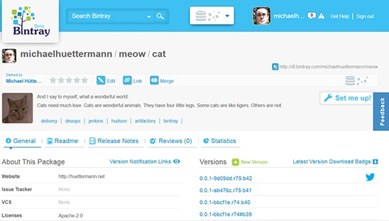 Bintray follows some conventions. We host repositories (in our case, meow), which is owned by me, michaelhuettermann. An access key must be generated in Bintray, and we deposit it in Hudson as a configuration variable. Our repository consists of a package named cat.