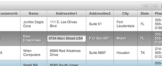In Listing 6, the customer addressline1 column will be editable, and when the cell is selected, the field will change to a p:inputText component, as shown in Figure 11. This makes editing within DataTable components very easy.