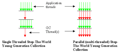 The figure (Fig. 1) illustrates the difference between the single threaded and parallel copy collection. The green arrows represent application threads, and the red arrow(s) represent GC threads. The application threads (green arrows) are stopped when a copy collection has to take place. In case of the parallel copy collector, the work is done by n number of threads compared to 1 thread in case of the single threaded copy collector.