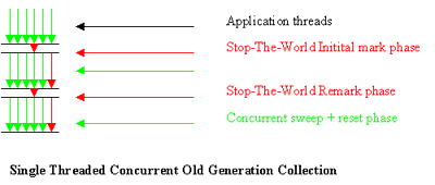 The figure (Fig. 2) illustrates the main phases of the concurrent collection. The green arrows represent application threads, and the red, GC thread(s). The small red arrow represents, the brief stop-the-world marking phases, when a snapshot of the heap is made. The GC thread (big red arrow) runs concurrently with application threads (green arrows) to mark and sweep the heap.