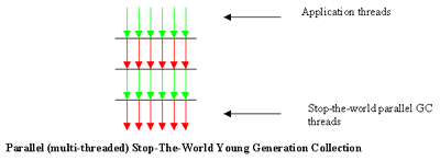 The figure (Fig. 3) illustrates the application threads (green arrows) which are stopped when a copy collection has to take place. The red arrow represents the n number of parallel threads employed in the collection.