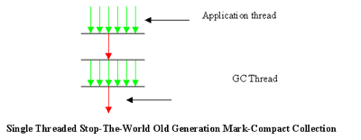 The figure (Fig. 4) illustrates a stop-the-world, old generation mark-sweep-compact collection. The application threads (green arrows) are stopped during the collection. The old generation collection single threaded.