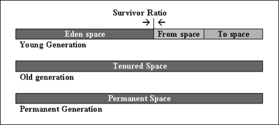Eden = NewSize - ((NewSize / ( SurvivorRatio + 2)) * 2) From space = (NewSize - Eden) / 2 To space = (NewSize - Eden) / 2NewSize is the size of the young generation and can be specified on the command line using -XX:NewSize option. SurvivorRatio is an integer number and can range from 1 to a very high value.
