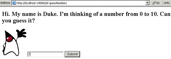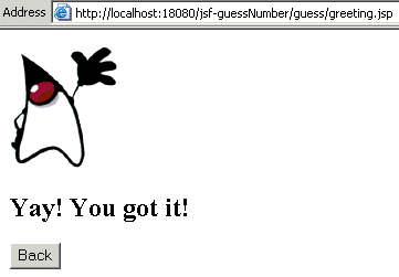 This section describes a sample application, a guessing number game, that comes with the JSF RI. The application, as shown in Figure 3 above, asks you to guess a number between 0 and 10, inclusive. If you enter the wrong number, you'll see something similar to Figure 4, and when you finally enter the right number, you'll see something similar to Figure 5. This application will give you a taste of the effort involved in developing web applications using the JSF technology.