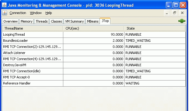 This starts the JConsole tool with an additional JTop tab that shows the CPU time that each thread in the application is using, as shown in Figure 7. The JTop tab shows that the LoopingThread is using a high amount of CPU time that is continuously increasing, which is suspicious. The developer should examine the source code for this thread to see whether it contains an infinite loop.