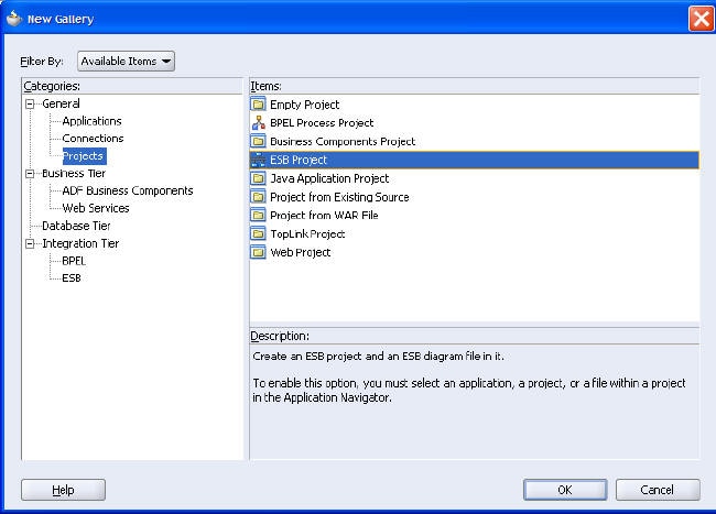 Go to the New Gallery and this time select the Projects, ESB Project item: