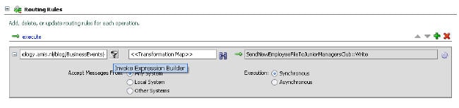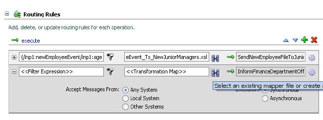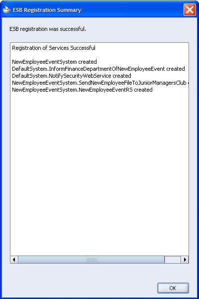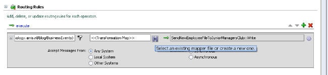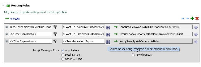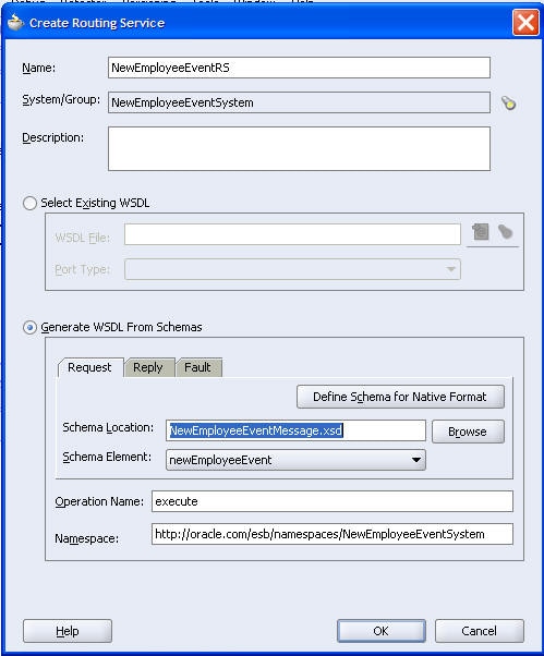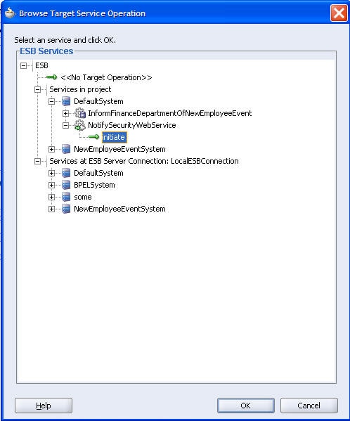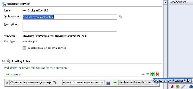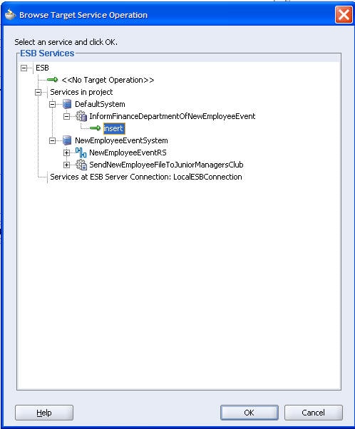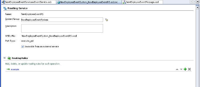 You will allow external processes to directly call into this NewEmployeeEventRS RoutingService through its Web Service interface. When other channels are to be used for publishing this event - for example, by putting a new Employee file on an FTP server, by entering the new employee in a database table, or through JMS - you can add inbound Adapter Services to the ESB Service, which will forward the messages they acquire to the NewEmployeeEventRS. For the moment, assume the HR department will use the Web Service interface.