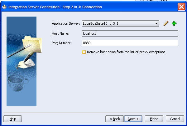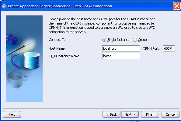 This next screen is where you specify exactly which application server instance to which you want to connect. To confirm you are using the correct value, check the opmn.xml file in the directory <soasuite_10_1_3_1_HOME>\opmn\conf. In this file, look for the value for the port element's request attribute.
