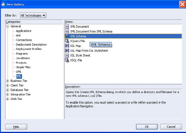 Go to the New Gallery, select the node General, XML and click on XML Schema in the list of available items. Then enter the name for the new XML Schema Document—in this case, NewEmployeeEventMessage.xsd.