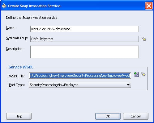 The Create Soap Invocation Service dialog pops up. Enter the name of this service, for example NotifySecurityWebService. Then click on the Service Explorer icon.