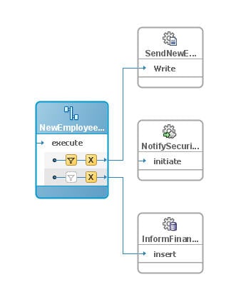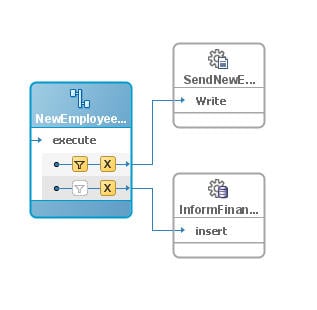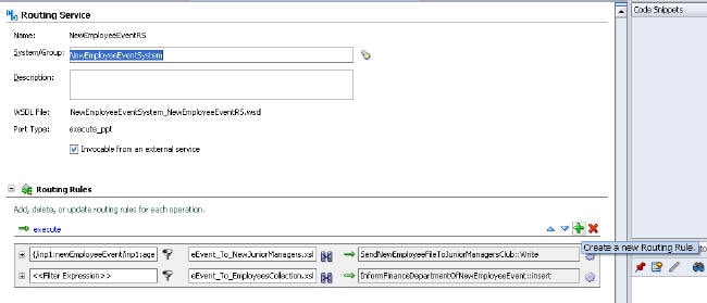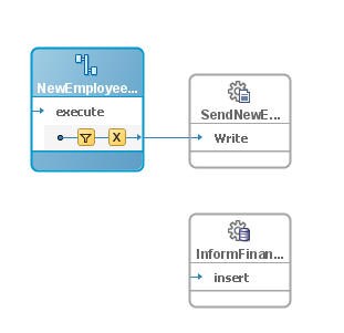 Double-click on the NewEmployeesRS icon to specify a routing rule that will pass the NewEmployeeEvent message to this target service.