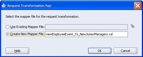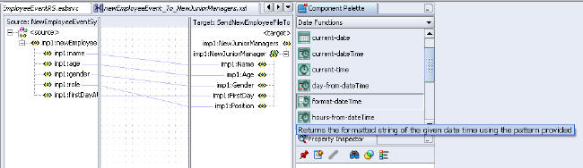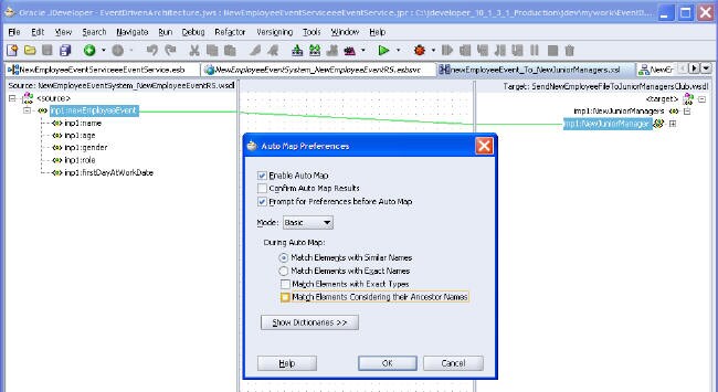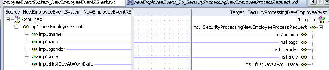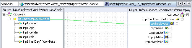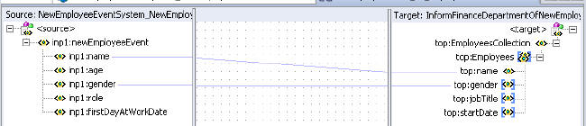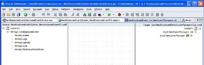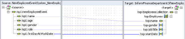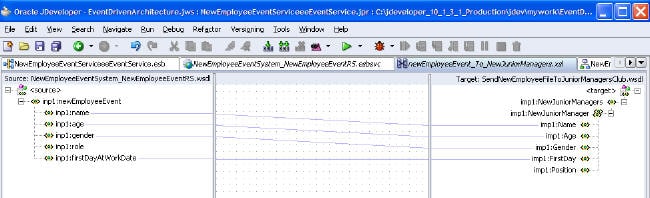 First drag-and-drop the newEmployeeEvent element on top of the NewJuniorManager, to create the simple, obvious mappings.