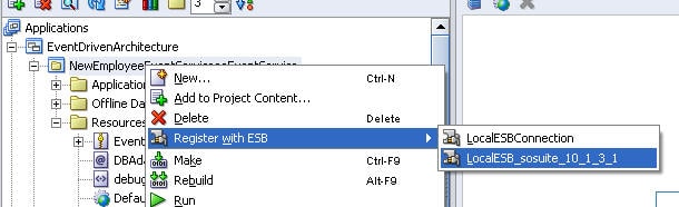 Click on the project with the right mouse button and select Register with ESB and select the LocalESB_soasuite_10_1_3_1 connection.