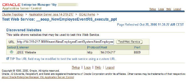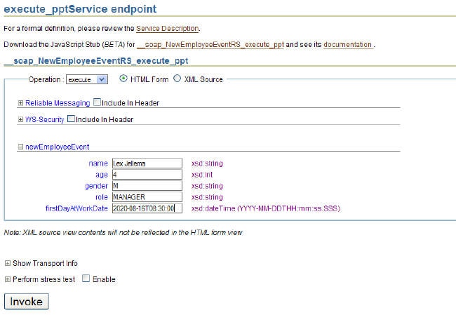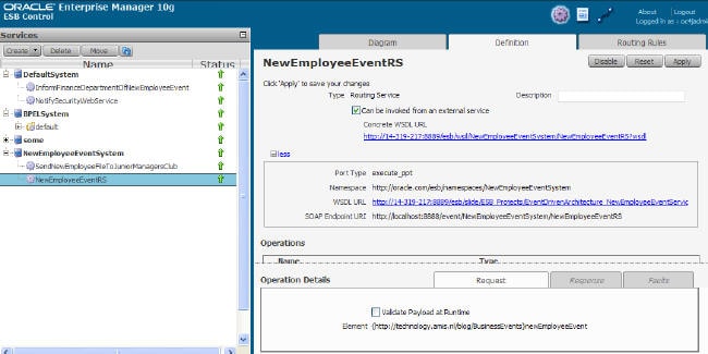 The NewEmployeeEventRS service can be invoked as a normal Web Service. You can find out its WSDL location if we go to the Definition Tab for this service: