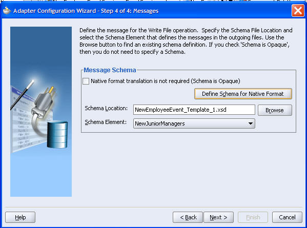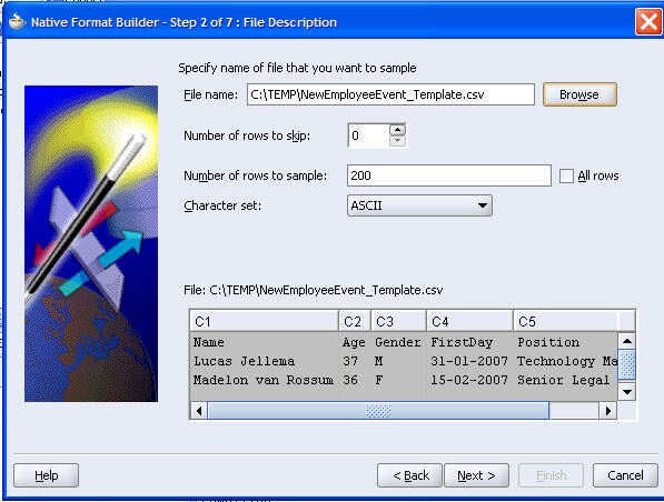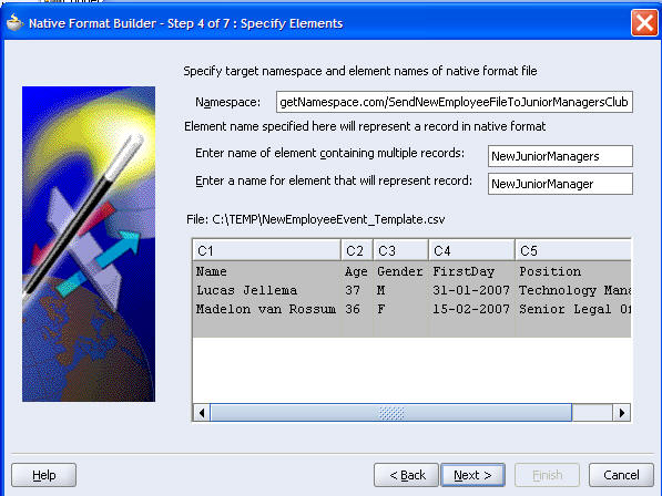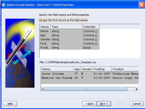 This takes you to the Native Format Builder, where you can create an XSD that the File Adapter can use to create a CSV file from the XML data fed into it. Use the sample CSV file the Junior Manager's Club was kind enough to send you.