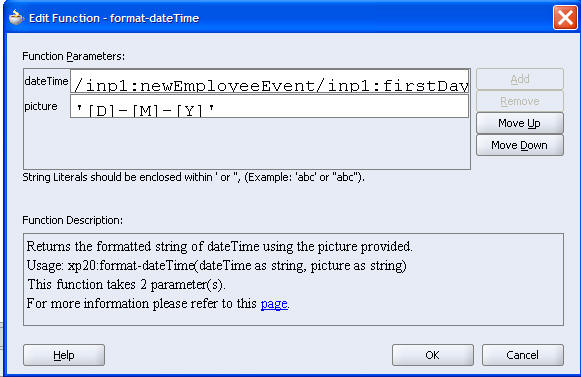 Drag and drop role to position . Then drag and drop the format-dateTime Date Function from the component palette on top of the connection from firstDayAtWorkDate to firstDay.