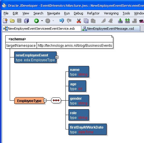 Before you can get started with the Event Handling Service in the ESB, you need to specify exactly what type of message we will receive from the HR Department upon the occurrence of the New Employee event. You do so by creating an XML Schema Document (XSD) that describes the structure of the XML message received for the event.