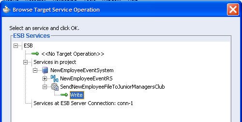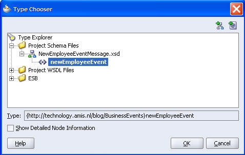 Drag & drop the Routing Service component from the Component Palette to the ESB Service. Enter the name for the Routing Service and - using the Browse button and Type Chooser, select the NewEmployeeEvent schema element in the NewEmployeeEventMessage schema definition.